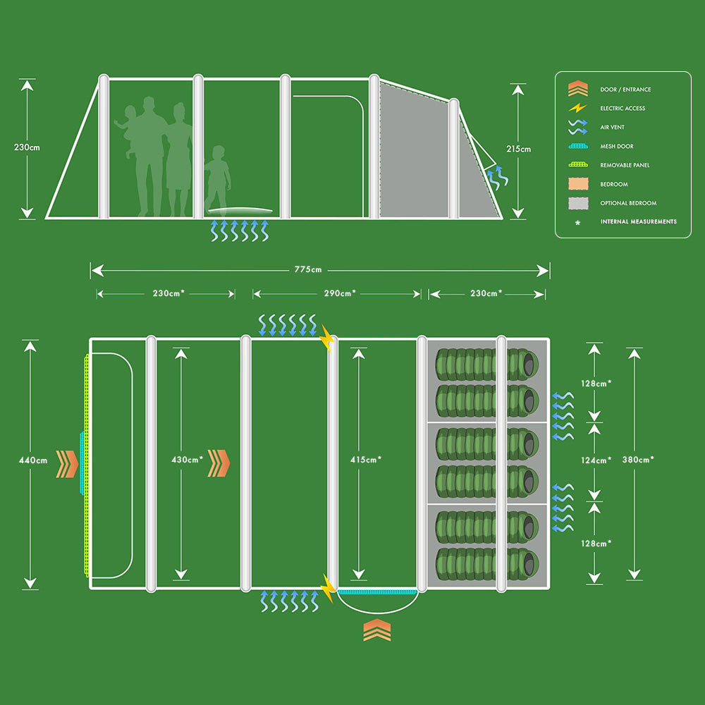 The spacious, fully-enclosed living area has an amazing height for a tent in this class of 230cm (7.5 feet) to provide a sense of grandeur. It only takes a few minutes to inflate this massive 6-man tent and a similar time to deflate fully, before rolling up and packing away with our roll direct to bag feature. The Air Tubes feature a built-in pressure release value, there's no way to over inflate, either from pumping or from increased temperature.