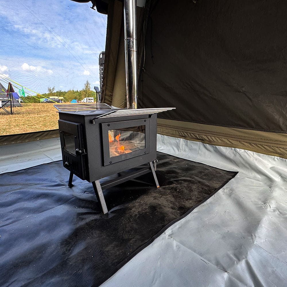 The Shelter comes with a stove port for those colder days ALWAYS ensure to use a heatproof matt underneath a stove or heat producing products to protect the groundsheet